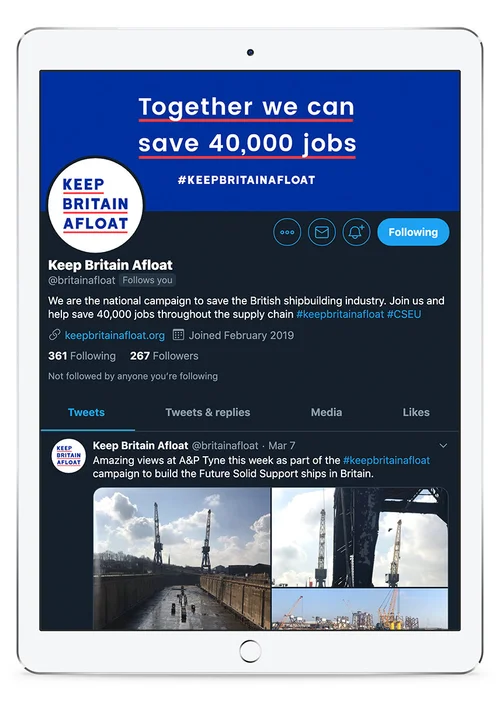 This campaign was created on behalf of the CSEU (Confederation of Shipbuilding and Engineering Unions) and was a collaboration with public affairs agency Interel, Upwards Group (digital strategy and production) and DWT (video production).